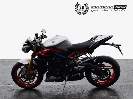 | Naked Bike Mit der neuen Street Triple 765 RX bringt Triumph 2026 eine besonders sportliche Variante seines bekannten Dreizylinders auf den Markt. voll einstellbare Öhlins NIX30-Upside-Down-Gabel mit 115 mm Federweg, die sich in Vorspannung, Druck- und Zugstufe regulieren lässt. Gemeinsam mit dem Öhlins STX40-Federbein soll sie für präzises Handling und optimale Kontrolle sorgen. Neu sind auch die Clip-on-Stummellenker. Die Triumph verfügt über eineTraktionskontrolle, Kurven-ABS, einen Quickshifter sowie ein TFT-Display mit intuitiver Menüführung. Für die individuelle Anpassung bietet Triumph rund 35 Originalzubehörteile. 188kg fahrfertig, 10.000km Service Intervall Verfügbar ab Februar 2026 Wir tauschen auch dein Motorrad gerne ein, und machen dir ein faires Angebot. Gerne erstellen wir dir auch ein persönliches Finanzierungsangebot auch ohne Anzahlung, mit monatlicher Rate oder1/2 oder 1/3 Finanzierung, kein Kasko nötig. Zustellung möglich. Wir haben ständig 100 Gebrauchtbikes in Leibnitz u. der Filiale Villach lagernd, alle Motorräder unter www.motorradklinik.at Irrtümer und Zwischenverkauf vorbehalten! FAHRZEUGSTANDORT KANN LEIBNITZ ODER VILLACH SEIN, BITTE ANFRAGEN! |